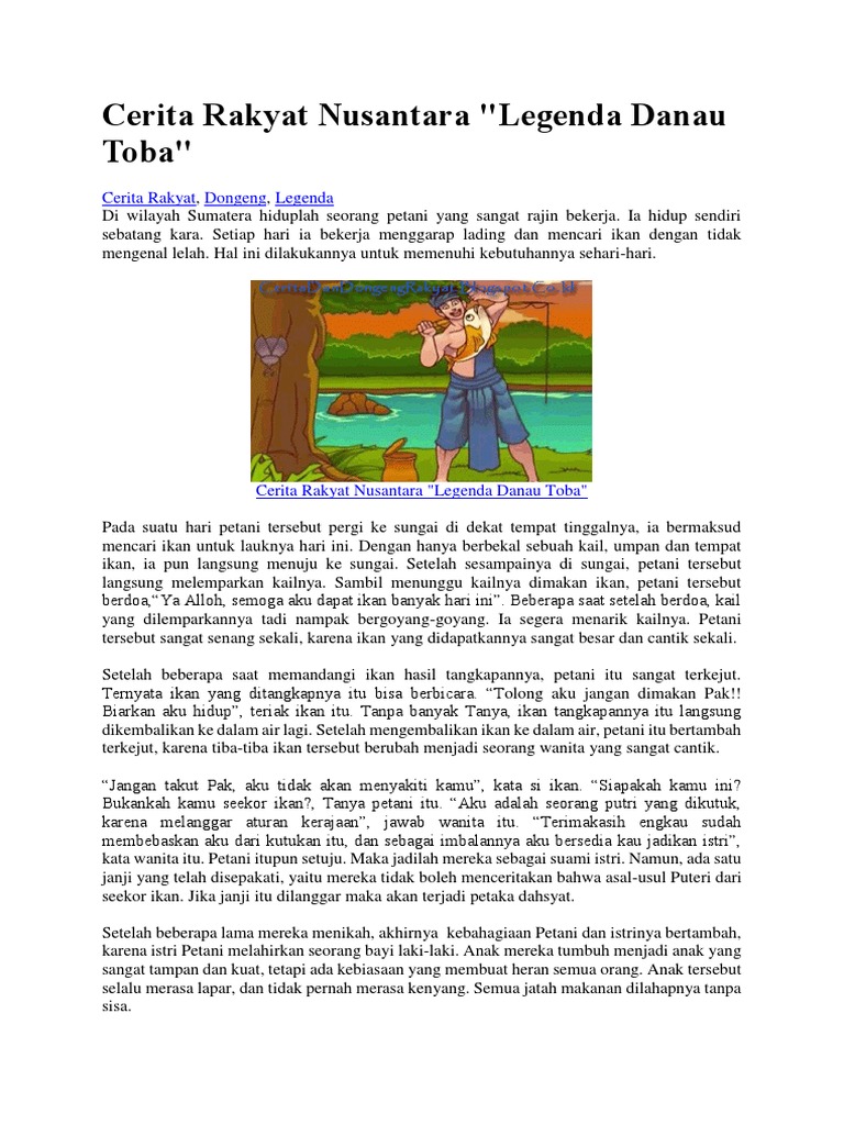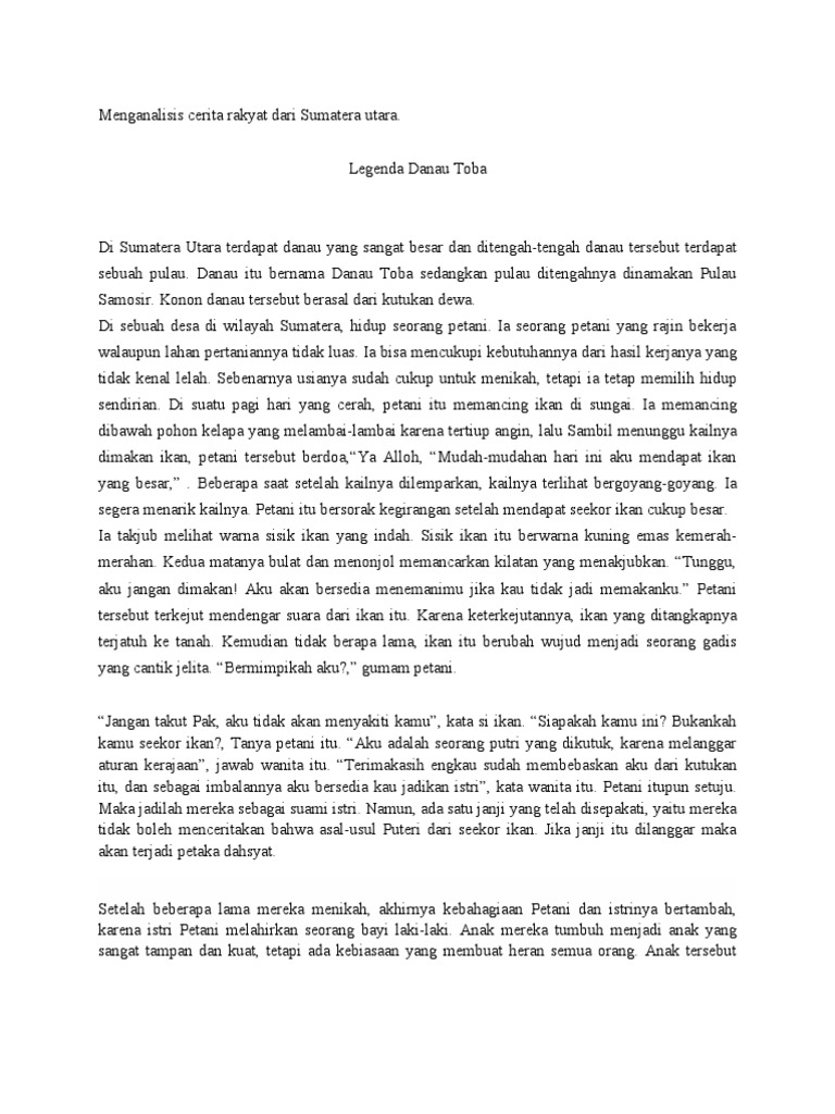 Kesehariannya disibukkan dengan bekerja di ladang dan sesekali pergi ke sungai mencari ikan untuk dijadikan santapan. Danau toba terletak di provinsi sumatera utara ini mendapat predikat sebagai danau terbesar di asia tenggara. Legenda danau toba merupakan cerita rakyat yang berasal dari sumatera utara tepatnya di pulau samosir yang berada di tengah danau toba danau ini memiliki panjang sekitar 100 km dan lebar 30 km. Sumanto diposting oleh setyo kasworo di 19 51.