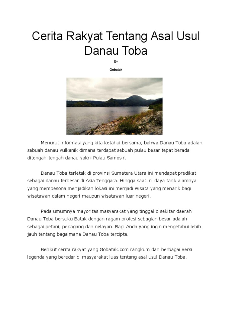 Cerita naratif danau toba dalam bahasa inggris cerita rakyat danau toba dan nilai nilai yang terkandung. Posting pada bahasa indonesia ditag 366 cerita rakyat nusantara 4 karakteristik hikayat 5 macam cerita rakyat apa pakartine crita rakyat iku asal usul bunga bangkai asal usul bunga melati cerita bernuansa islam cerita dongeng timun mas cerita fabel pdf cerita rakyat 5 tokoh cerita rakyat batu menangis cerita rakyat biasane anonim tegese cerita rakyat danau toba cerita rakyat jaka. Cerita rakyat danau toba lake toba dalam bahasa inggris dan terjemahannya danau toba lake toba dalam bahasa inggris a long time ago lived a young man named toba. Cerita danau toba bahasa indonesia cerita danau toba dalam b inggris.
