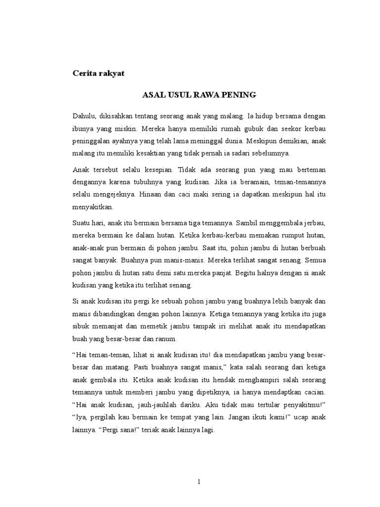 Demikian cerita yang melingkupi terjadinya sebuah danau di daerah semarang yang diberi nama rawa pening. Mengetetahu legenda rakyat yang melandasi asal muasal danau rawa pening tentu menjadi tambahan wawasan untuk kita semua. Rawa air asin rawa air asin adalah rawa yang memiliki kandungan air terdiri dari air asin atau air laut. Hal ini karena rawa pening saat ini menjadi objek wisata yang banyak diminati oleh wisatawan.