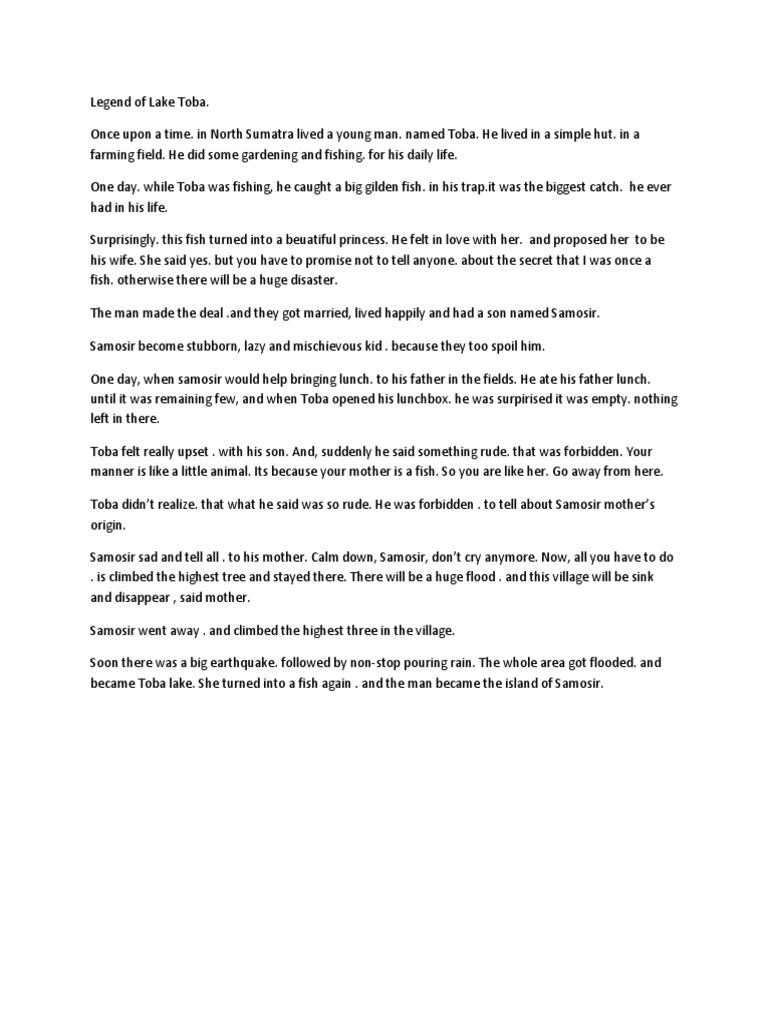 There is also a folklore that told as part of history of toba lake. They way the writer or story teller arranged his paragraphs into interesting and meaningful story is what we call generic structure. Folklore about the legend of toba lake. A viennese original called chris bold and wrinkled living in toba for almost 40 years and married to a batak lady told me about this legend disturbed only by the ringing church bells and the sea otters playing in the lake.