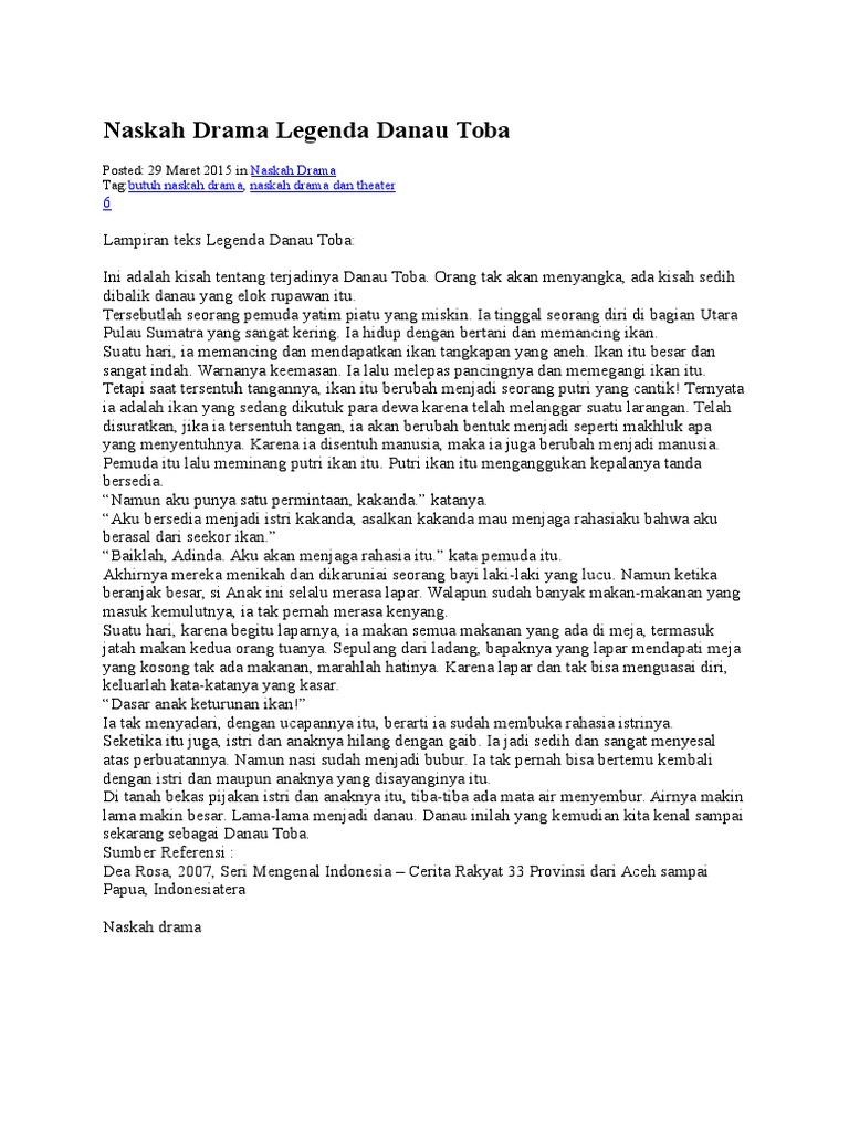 Naskah drama danau toba 3 orang. Contoh naskah drama danau toba dalam bahasa inggris dan artinya narator. Pulau itu kini dikenal dengan nama pulau samosir karena banyak orang beranggapan di sanalah samosir berdiri untuk menyelamatkan diri dan danau yang ada di sekitarnya disebut dengan danau toba yang merupakan desa di mana pa toba tinggal dan terkena rendaman air yang sangat deras itu. Naskah drama asal nama danau toba. Lampiran teks legenda danau toba.