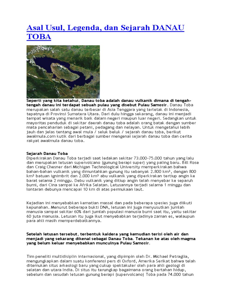 Danau ini membentang dari sampai. Bill rose dan craig chesner dari michigan technological university memperkirakan jumlah total material dalam letusan sekitar 2 800 km3 sekitar 2 000 km3 aliran ignimbrite di atas tanah dan sekitar 800 km3 yang jatuh sebagai abu ke arah. Sejarah danau toba diperkirakan danau toba sudah terbentuk selama ledakan sekitar 69 000 77 000 tahun yang lalu dan merupakan letusan supervolcano terbaru. Cerita rakyat sejarah danau toba terbentuk.