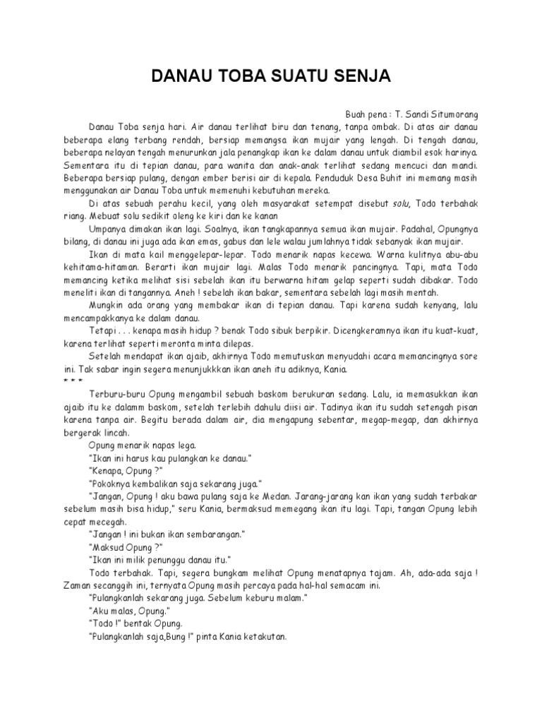Oia apakah kalian tahu siapa pengarang cerita danau toba yang pertama kalai. Menurut informasi yang kita ketahui bersama bahwa danau toba adalah sebuah danau vulkanik dimana terdapat sebuah pulau besar tepat berada ditengah tengah danau yakni pulau samosir. Cerita rakyat danau toba lake toba dalam bahasa inggris dan terjemahannya danau toba lake toba dalam bahasa inggris a long time ago lived a young man named toba. Cerita dan terjemahannya kumpulan cerita rakyat cerita malin kundang bahasa inggris cerita rakyat bahasa inggris singkat dongeng dalam bahasa inggris navigasi pos.
