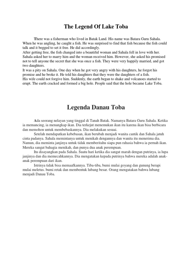 Contoh narrative text dan artinya. Contoh narrative text legend alias legenda dalam bahasa inggris yakni terjadinya danau toba batu menangis tangkuban perahu candi prambanan dan selat bali. Story telling danau toba untuk kalian yang dikasih tugas dari guru bahasa inggris untuk membuat menghafal story telling cerita rakyat alwan punya nih judulnya danau toba ceritanya singkat padat jelas dan cetar menggelegar membahana badai. Dia memiliki dua kemampuan yang sangat baik dalam hal perikanan dan pertanian.